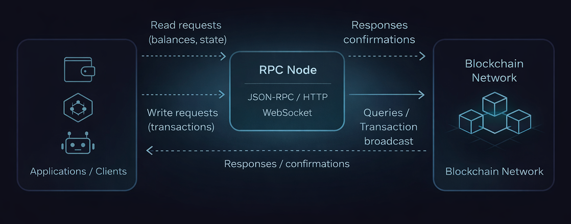 An RPC node is a specialized blockchain server that acts as a communication bridge between applications (wallets, dApps, explorers) and the blockchain itself. It lets developers query on-chain data or submit transactions without forcing every user to run a full node locally, which would be absurdly heavy for most devices.
